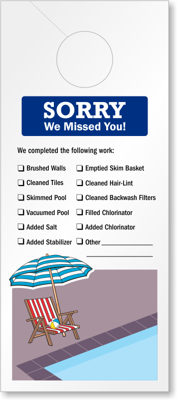 Inform residents about the pool services carried out while they were not around. Use this cool hang tag with a checklist to maintain a record and inform them about the work.