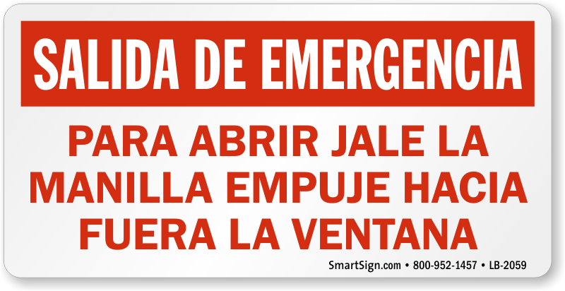 Spanish Emergency Exit Label: Para Abrir Jale La Manilla Empuje Hacia Fuera La Ventana Learn More...