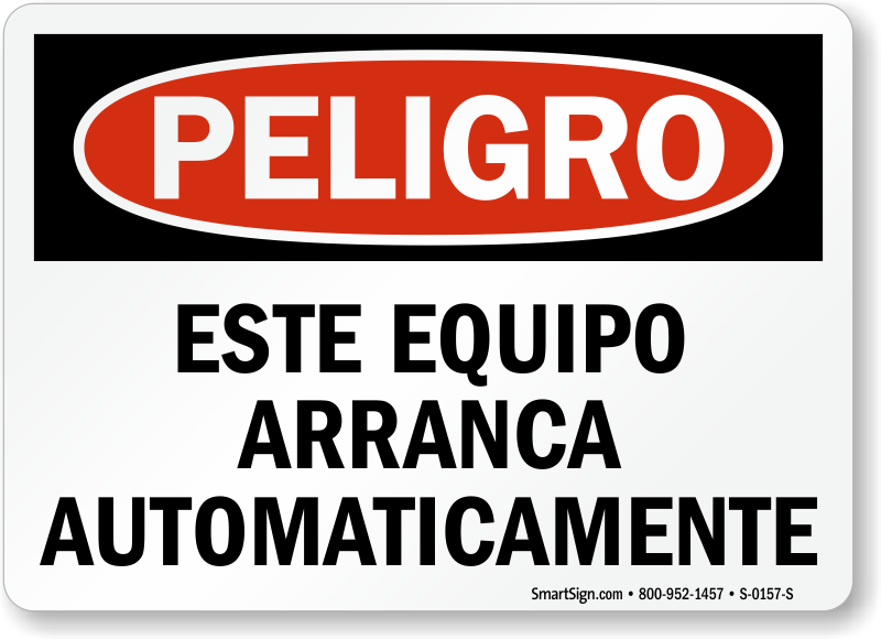 Include your Hispanic workforce into the safety program of your facility by posting a sign in Spanish. Post this OSHA Danger sign in Spanish and ask workers to stay careful with equipment that start automatically.