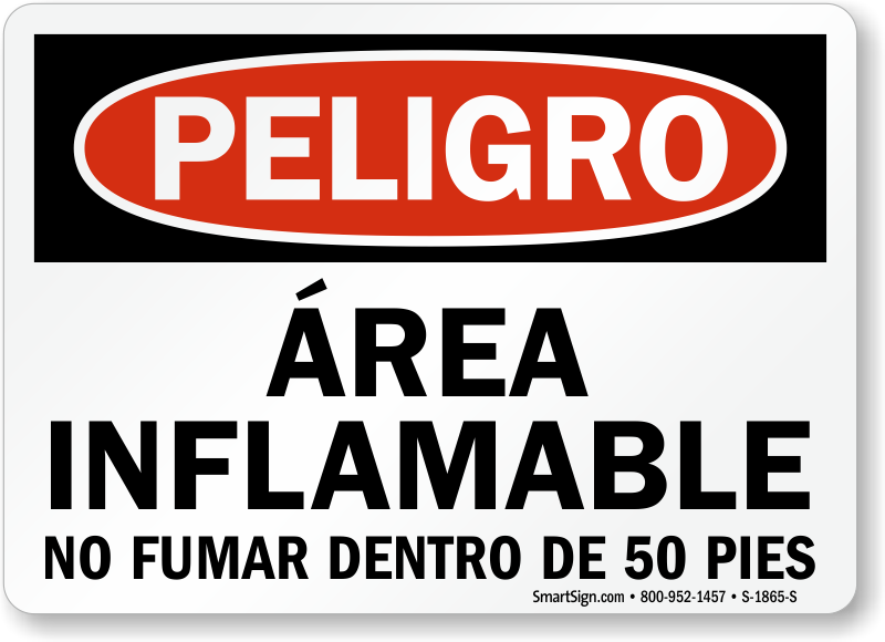 A sign in Spanish will communicate the message clearly to your Hispanic workers. Deploy this Spanish OSHA Danger sign to notify of the flammable area and prohibit smoking.