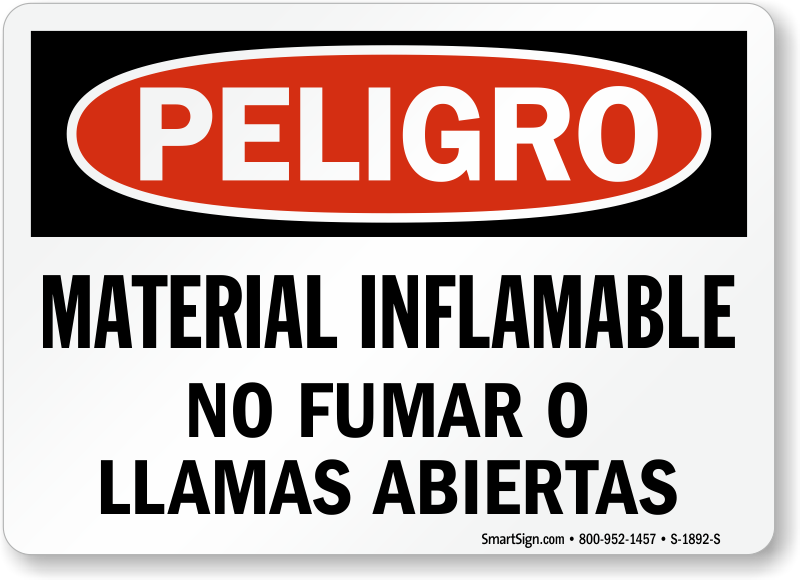 Spanish OSHA Danger - Flammable Material No Smoking or Open Flames sign reinforces compliance at all times.
