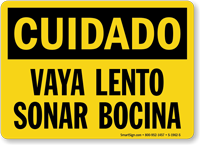 Instruct Hispanic drivers to go slow and sound horn by giving out important information in this Spanish OSHA Caution sign.