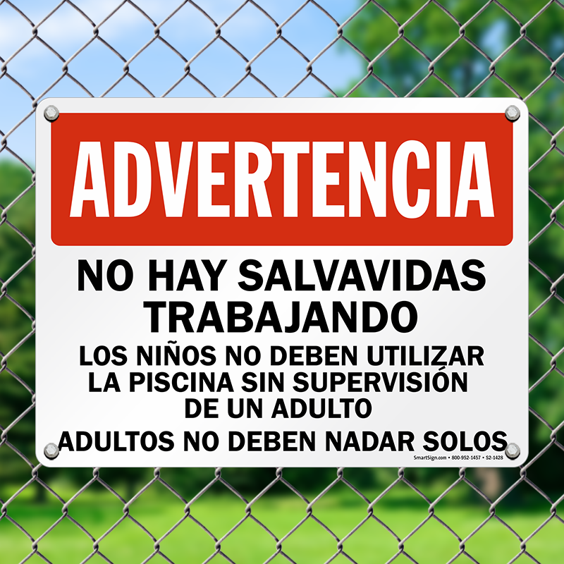 Spanish No Lifeguard on Duty Sign: Advertencia, No Hay Salvavidas Trabajando, Adultos No Deben Nadar Solos S2-1428 Learn More...