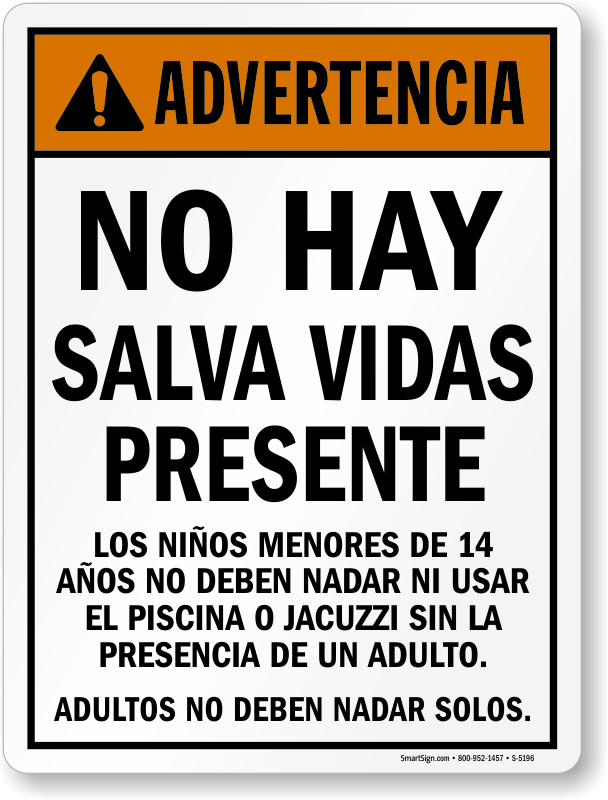 Spanish No Lifeguard On Duty Sign: Advertencia No Hay Salva Vidas Presente S-5196 Learn More...