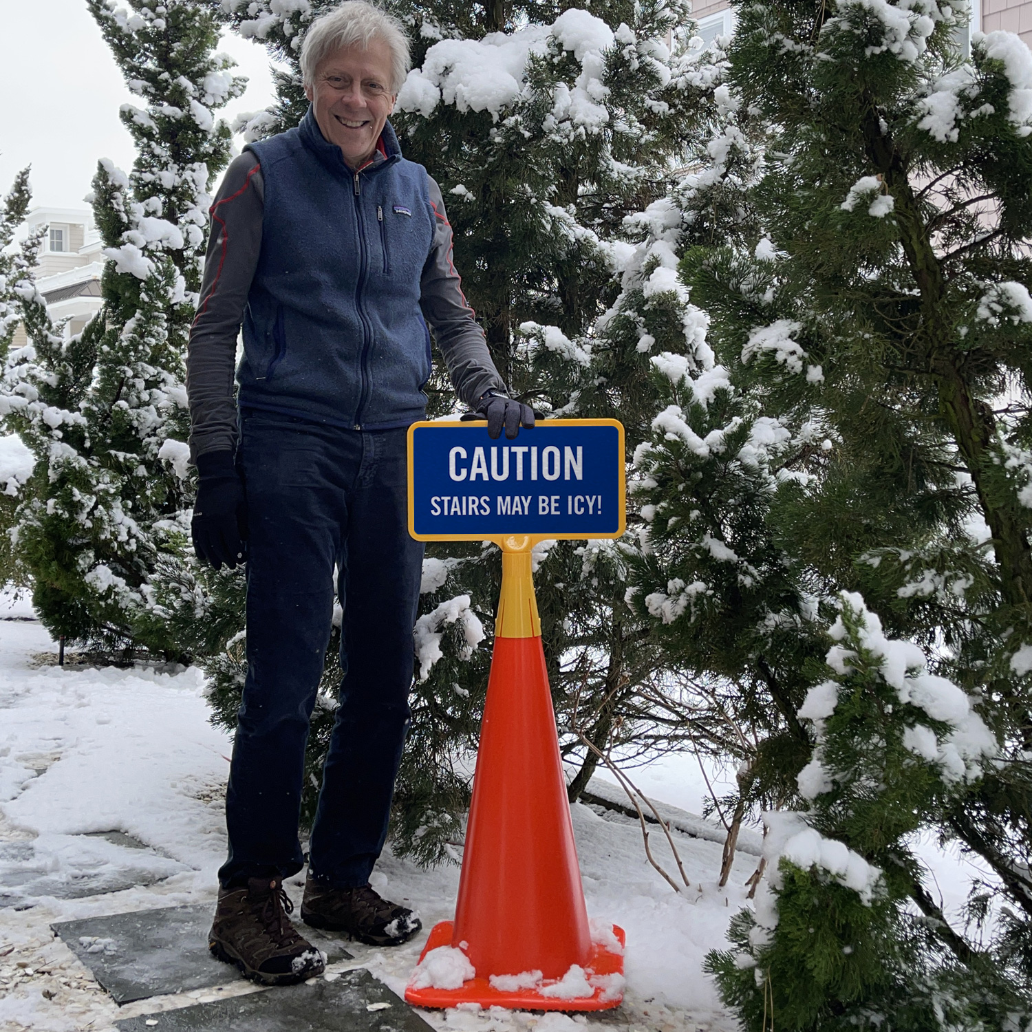 Warn people about the slippery stairs during icy conditions to prevent slipping and falling, with this highly visible no-tip, portable Traffic Cone Sign.