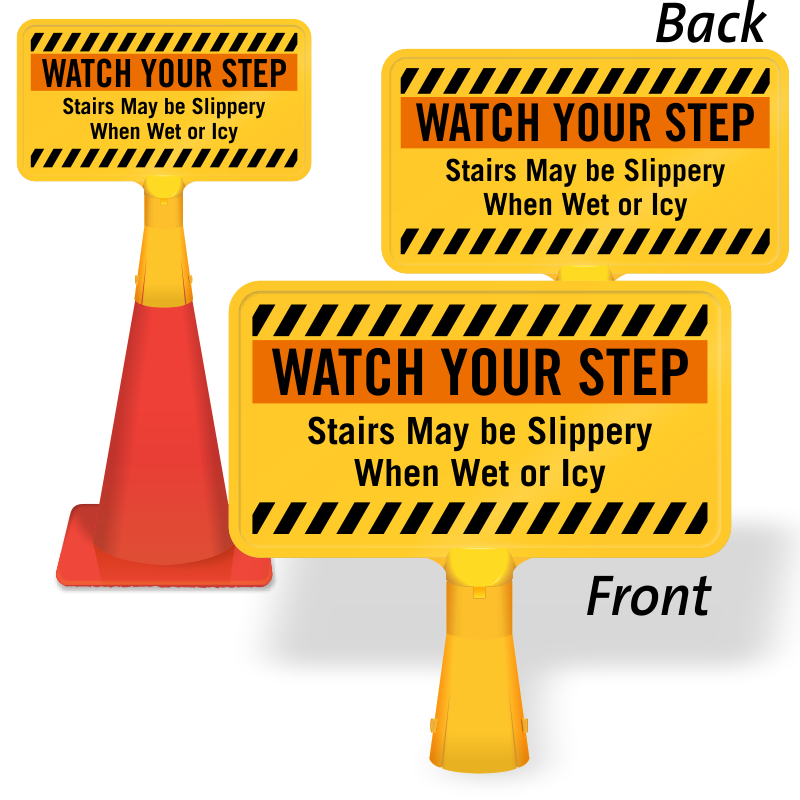 Prevent potential injuries caused by slip and fall hazards. Alert everyone to slippery stairs when wet or during icy conditions with this highly visible no-tip, portable Traffic Cone Sign.