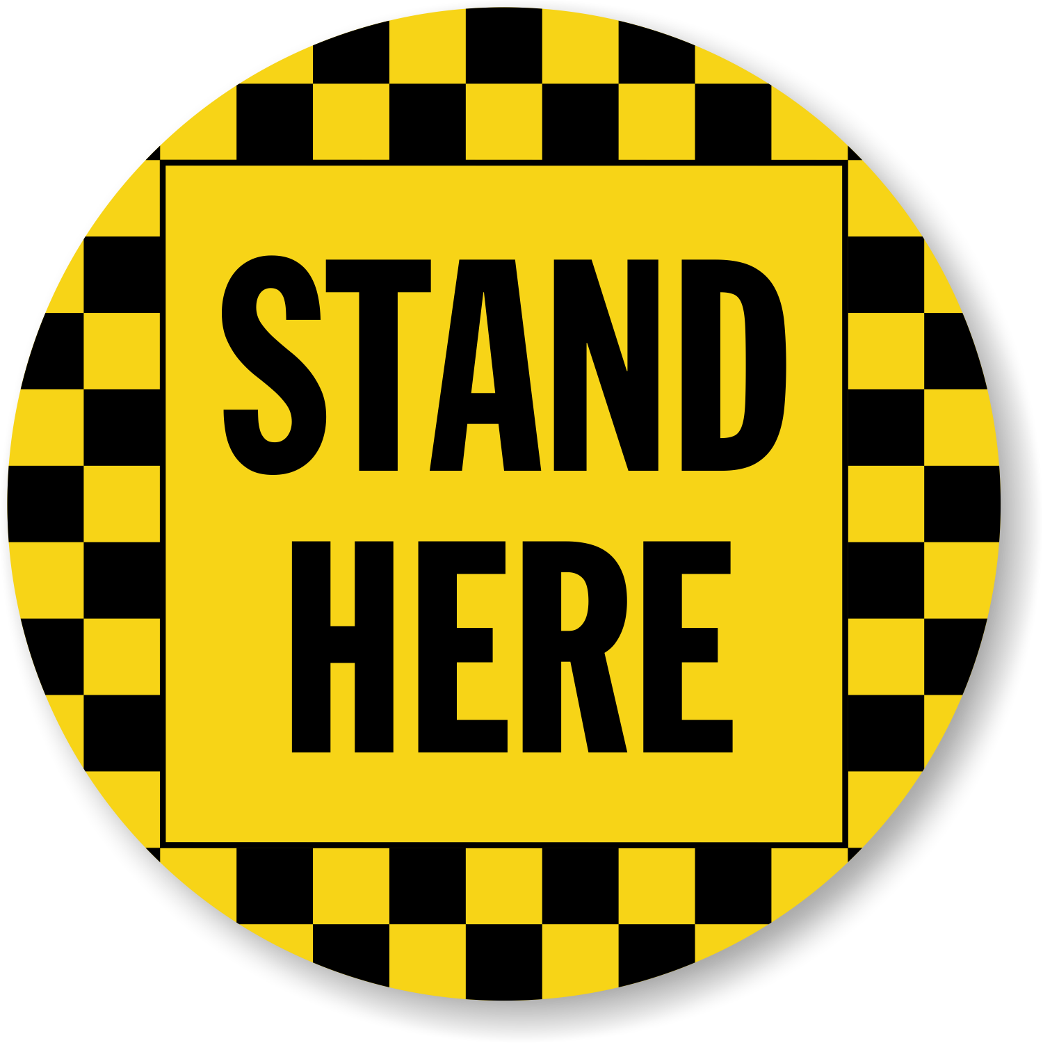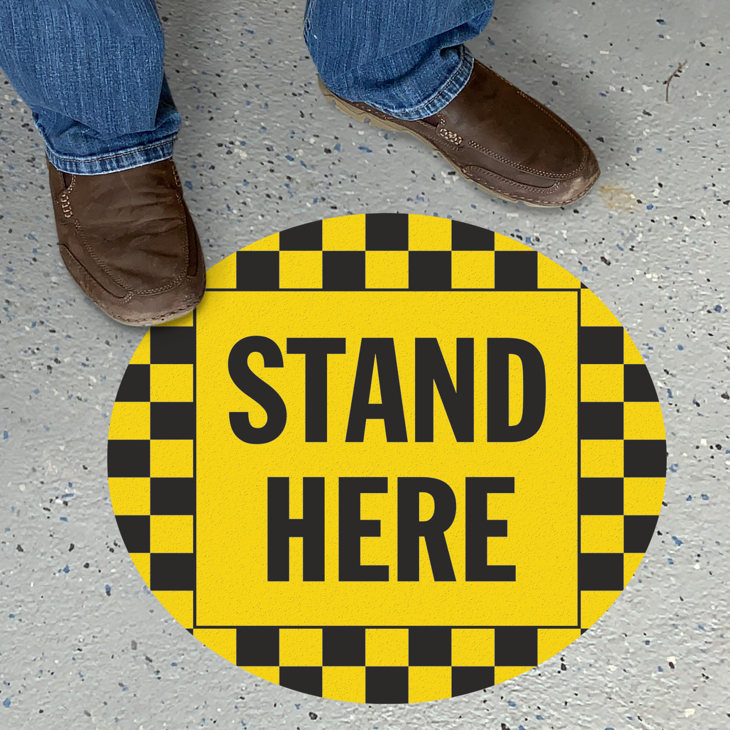 This bold yellow and black Stand Here Floor Sign stays at its place for years. Easily to clean and maintain.