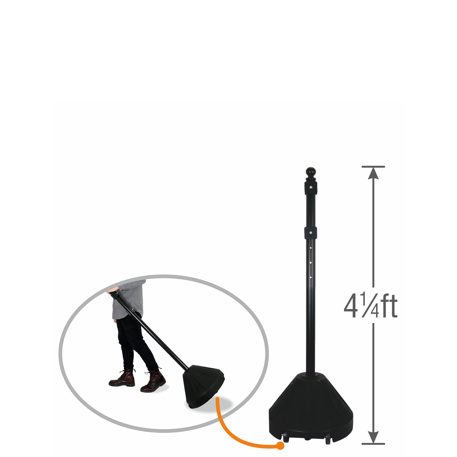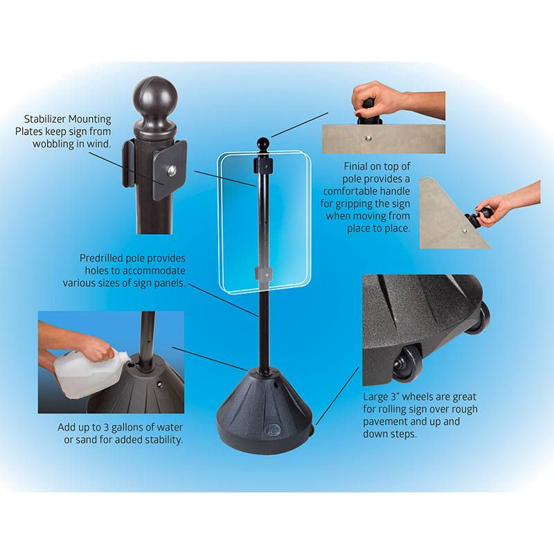 Aerodynamic, flexible, sturdy, stable and portable, this Standard Black Roll 'n' Pole Sign Holder helps you display a message anywhere you want. The unit does not lifting or carrying - recessed wheels can be engaged by tipping the unit.