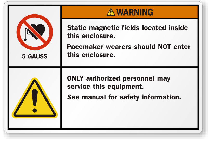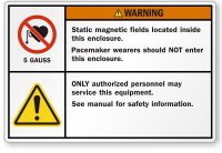 ANSI Warning Label: Static Magnetic Fields Located Inside This Enclosure, Pacemaker Wearers Should Not Enter (with 2 Symbols) LB-0105 Learn More...