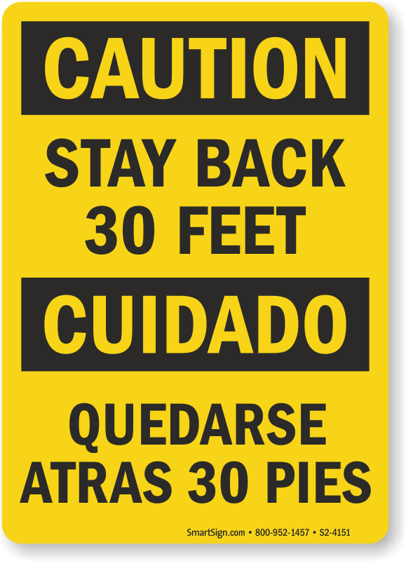 Bilingual OSHA Caution / Cuidado Sign mentions the safe distance to be maintained (30 feet) between vehicles.