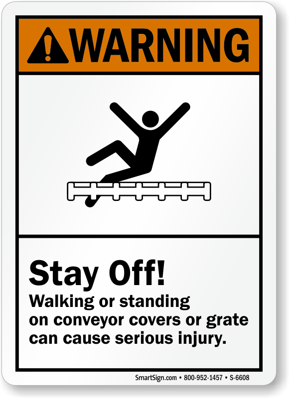 Walking or standing on conveyor covers can cause serious injury. Install this ANSI sign to notify workers of the same.