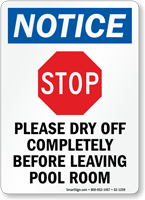 Remind pool users to dry off completely before leaving the pool area with this OSHA Notice Sign.
