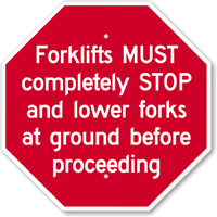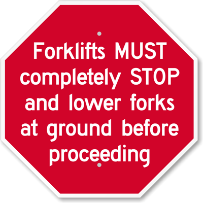 Stop Sign: Forklifts MUST Completely STOP And Lower Forks At Ground Before Proceeding K-5822 Learn More...
