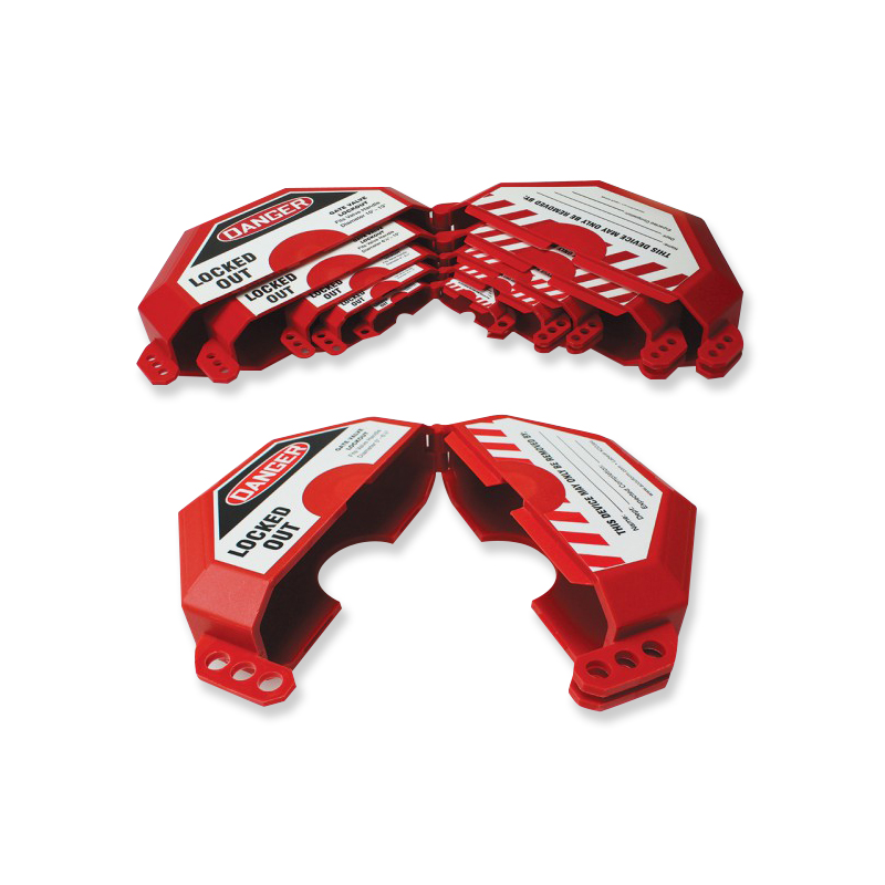 Keep valves in open or close position without worrying about anyone tampering it. Gate valve lockout's hinged clamshell encloses the valves and prevents them from being turned. Lockout device features a tough aluminum hinge with permanent binding pin that withstands repeated use, opens and closes easily. Unique pryguard prevents anyone from inserting a screwdriver to pry them apart. Offered with visible safety label to display safety information.