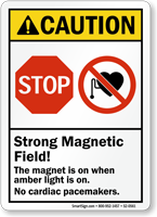 ANSI Caution Sign: Strong Magnetic Field! The Magnet is On When Amber Light Is On, No Cardiac Pacemakers (With No Pacemaker & Stop Symbol) S2-0561
