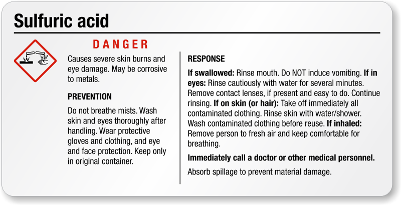 This small Sulfuric Acid GHS Label consists of everything - signal word, pictograms, hazard and precautionary statements - as required under OSHA 29 CFR 1910.1200.