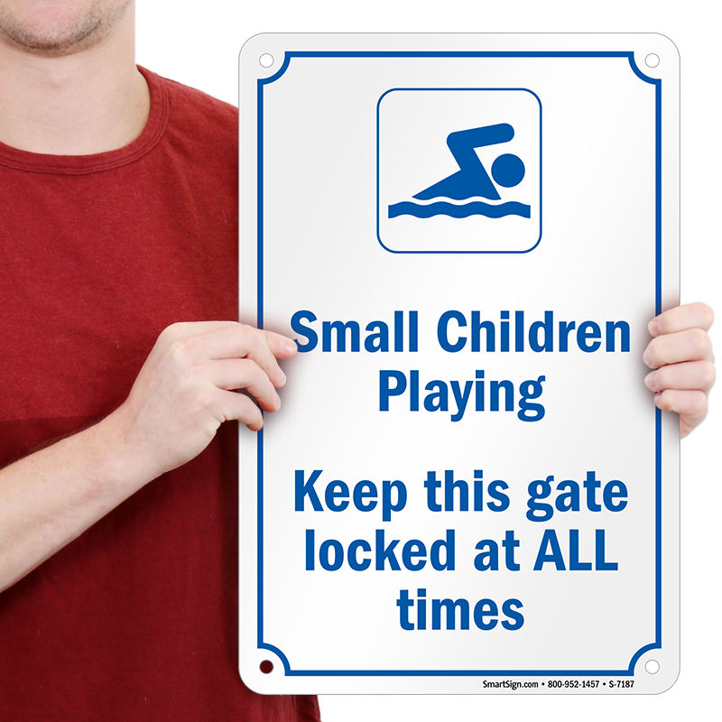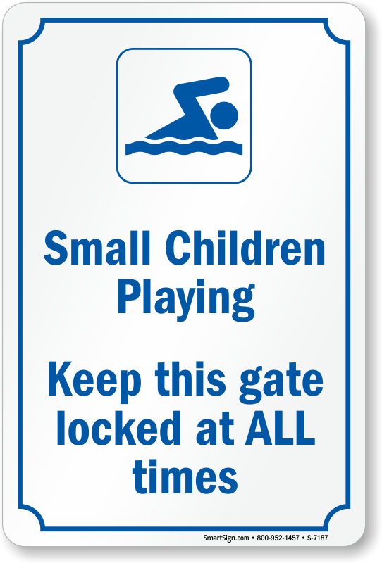 Small Children Playing Sign: Keep this Gate Locked At All Times With Person Swimming Graphic S-7187
