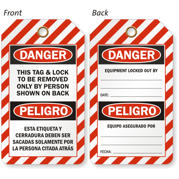 Bilingual Danger OSHA Lockout Tag clearly identifies the person involved in lockout procedure of a machine or equipment.