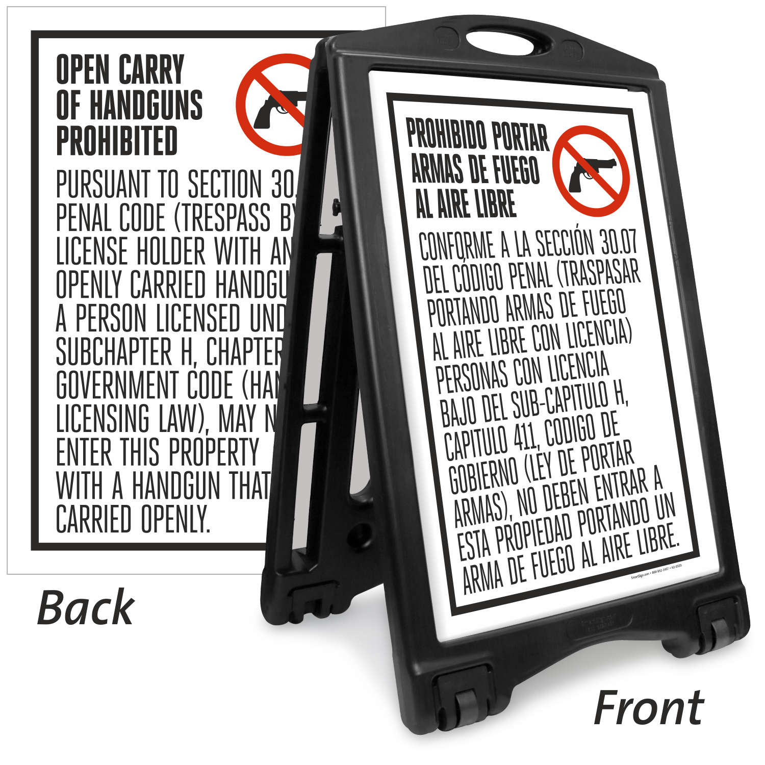 Required language appears in English on one side and Spanish on the other with this sidewalk sign kit. Text on both panels complies with section 30.07 of the Texas Penal Code, helping you ban open carry of handguns on your property.