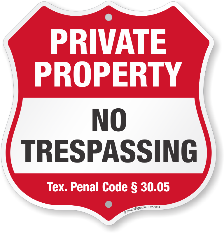 Texas Private Property Shield Sign: No Trespassing - Tx Code § 30.05 K2-5034 Learn More...