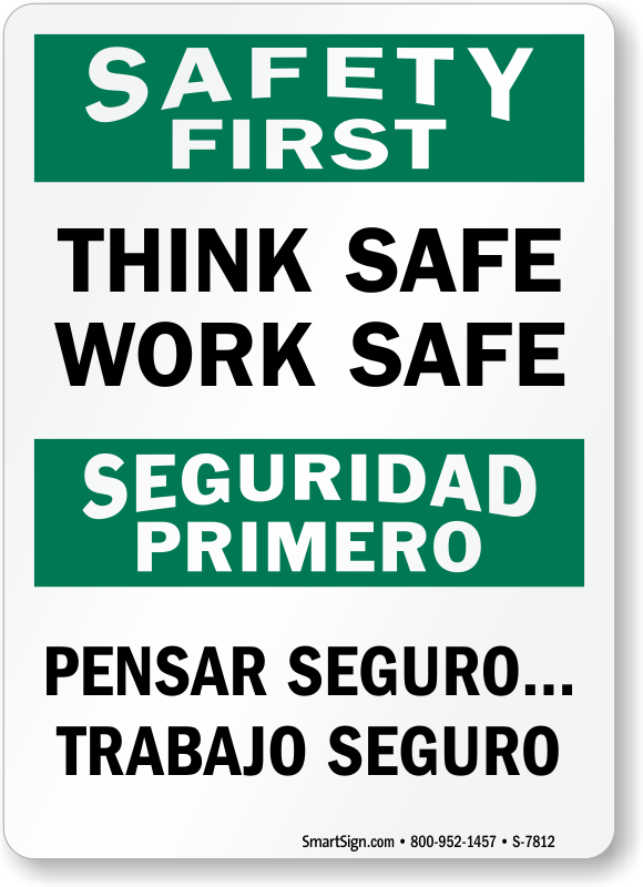 Bilingual OSHA Safety First / Seguridad Primero Sign: Think Safe Work Safe, Pensar Seguro Trabajo Seguro Learn More...