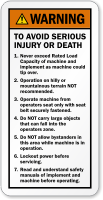 Everything has a limit. An ANSI instructions label for proper procedure reminds operators of capacity and safety regulations.