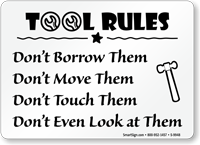 Tool Rules Sign: Don't Borrow Them, Don't Move Them, Don't Touch Them, Don't Even Look at Them (with Hammer Symbol) S-9948 Learn More...