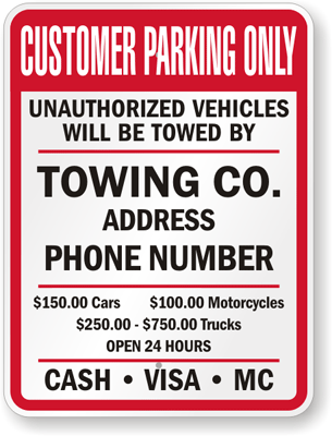 Custom Tow Away Sign: Customer Parking Only, Warning Unauthorized Vehicles Will Be Towed By, Towing Co. Address Phone, $150.00 Cars, $ 100.00 Motorcycles, $250.00 - $750.00 Trucks, Open 24hrs, Cash,...