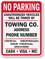 Custom Tow Away Sign: Fire Lane-No Parking, Unauthorized Vehicles Will Be Towed By, Towing Co. Address Phone, $150.00 Cars, $ 100.00 Motorcycles, $250.00 - $750.00 Trucks, Open 24hrs, Cash, Visa, MC