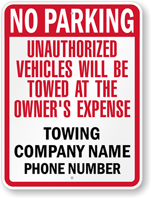 Custom Tow Away Sign: No Parking, Unauthorized Vehicles Will Be Towed At The Owner's Expense, Towing Co. Name, Phone Number