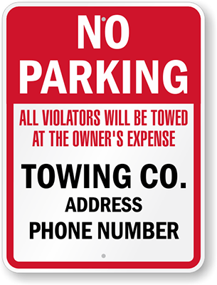 Custom Tow Away Sign: No Parking, All Violators Will Be Towed At The Owner's Expense, Towing Co. Name Address, Phone Number