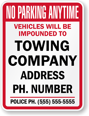 Custom Tow Away Sign: No Parking Anytime, Vehicles Will Be Impounded To Towing Company Address Ph. Number, Police Ph.(555) 555-5555