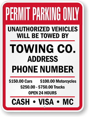 Custom Tow Away Sign: Permit Parking Only, Warning Unauthorized Vehicles Will Be Towed By, Towing Co. Address Phone, $150.00 Cars, $ 100.00 Motorcycles, $250.00 - $750.00 Trucks, Open 24hrs, Cash,...