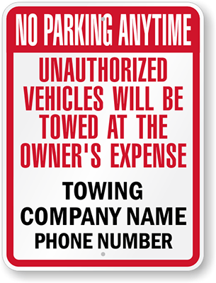 Custom Tow Away Sign: No Parking Anytime, Unauthorized Vehicles Will Be Towed At The Owner's Expense, Towing Co. Name, Phone Number