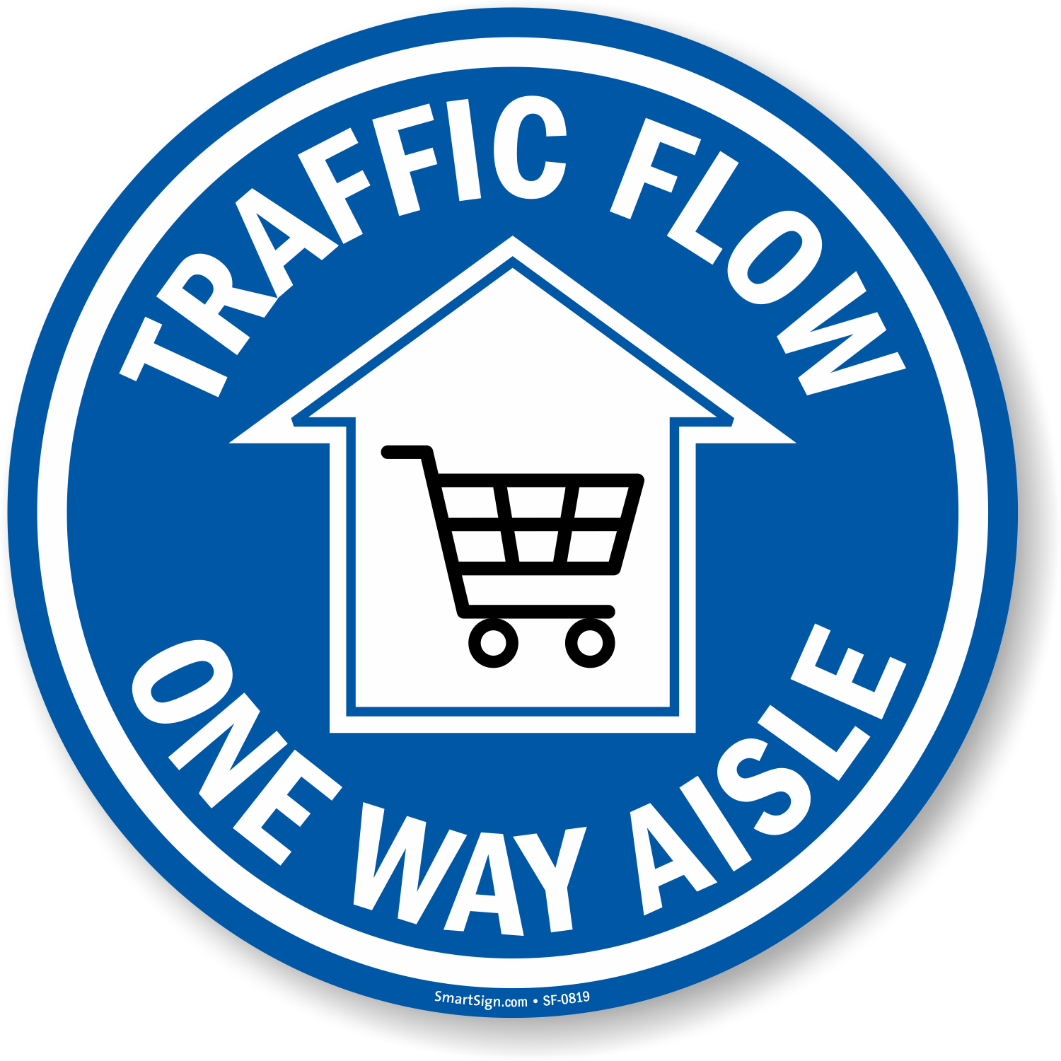 This circular sign for floors with a shopping cart symbol in between tells shoppers the correct direction of flow of traffic.