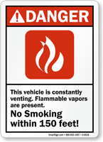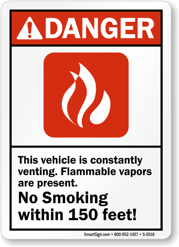 Smoking in the presence of flammable vapors can prove dangerous. Prohibit smoking within the vicinity of vehicle that constantly vents by using this ANSI danger sign.