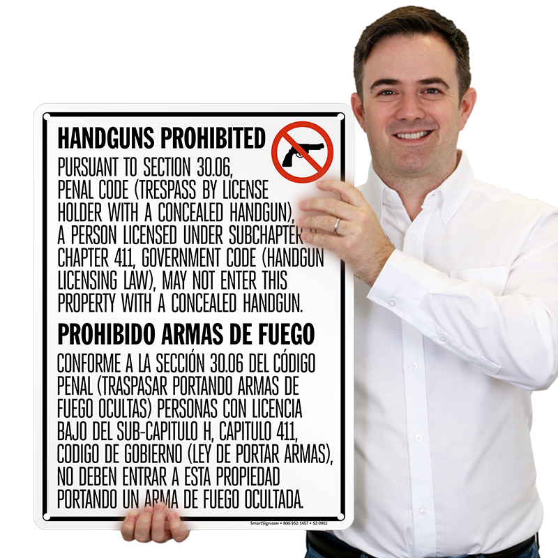 Bilingual No Concealed Carry Sign, Texas (Vertical): Handguns Prohibited/Prohibido Armas De Fuego. Pursuant to Section 30.06, Penal Code (with graphic) S2-0951 Learn More...