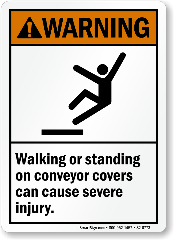 ANSI Warning Sign: Walking Or Standing On Conveyor Covers Can Cause Severe Injury (With Man Tripping Graphic) S2-0773