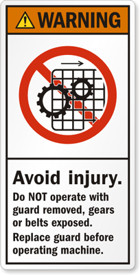 ANSI Warning Safety Label: Avoid Injury, Do Not Operate With Guard Removed, Gears Or Belts Exposed, Replace Guard Before Operating Machine LB-0288 Learn More...