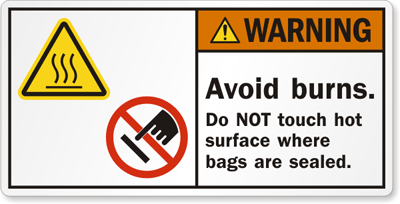 ANSI Warning Safety Label: Avoid Burns Do Not Touch Hot Surface Where Bags Are Sealed. LB-0297 Learn More...