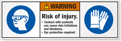 ANSI Warning Safety Label: Risk Of Injury, Contact With Contents Can Cause Skin Irritations And Blindness, Eye Protection Required LB-0324 Learn More...