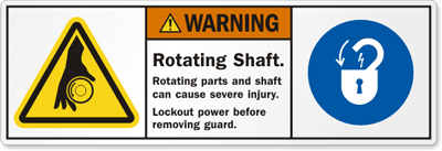 ANSI Warning Safety Label: Rotating shaft. Rotating parts and shaft can cause severe injury .Lockout power before removing guard LB-0383 Learn More...