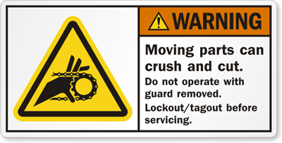 ANSI Warning Hand Crush Label: Moving Parts Can Crush And Cut, Do Not Operate With Guard Removed, Lockout/Tagout Before Servicing LB-0268 Learn More...
