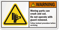 Hand Crush Force From Right ANSI Warning Label: Moving Parts Can Crush And Cut, Do Not Operate With Guard Removed, Follow Lockout Procedure Before Servicing LB-0146 Learn More...