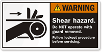 Warning Safety Label: Shear Hazard - Do Not Operate With Guard Removed, Follow Lockout Procedure Before Servicing LB-0338 Learn More...