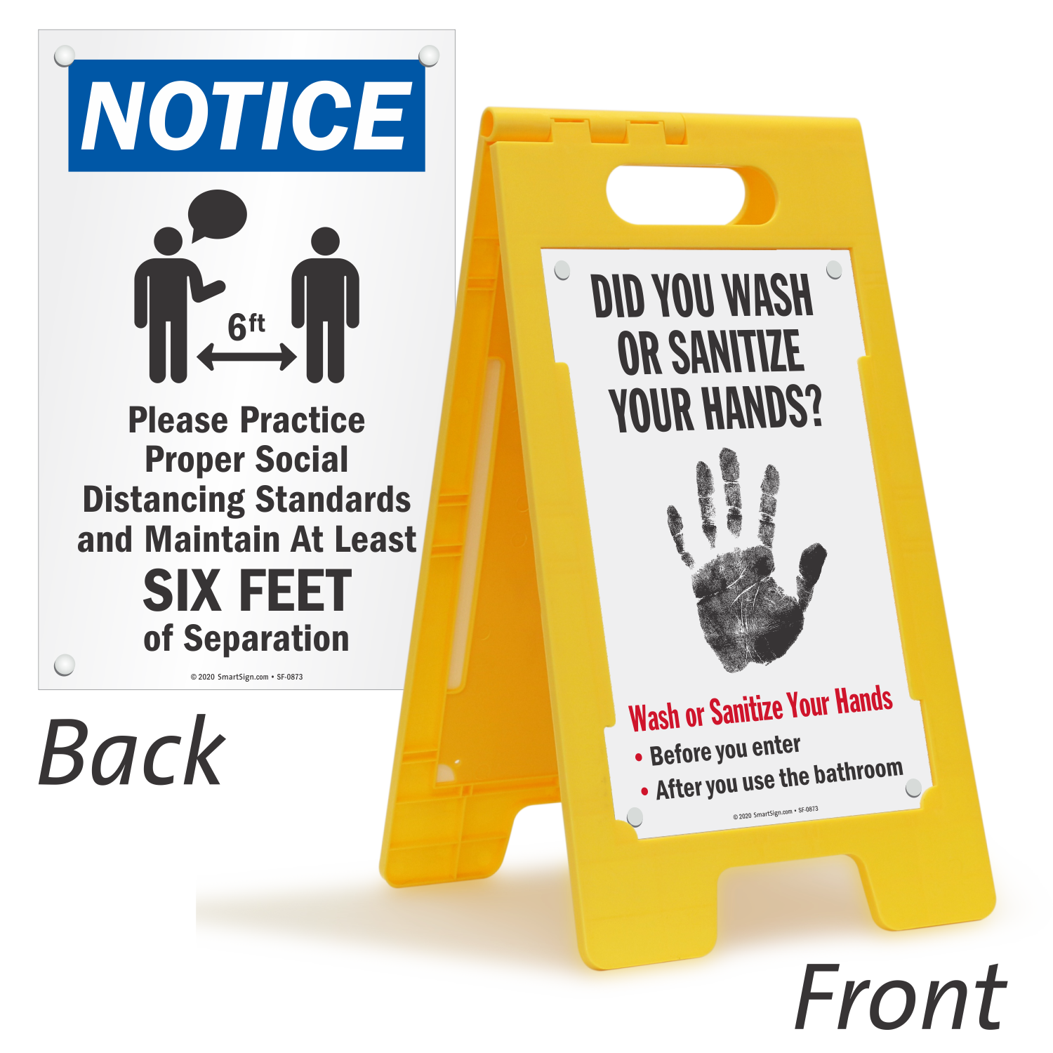 FloorBoss Standing Floor Sign: Wash Or Sanitize Your Hands Before You Enter And After You Use The Bathroom / Notice - Practice Social Distancing Standards, At Least Six Feet Of Separation SF-0873