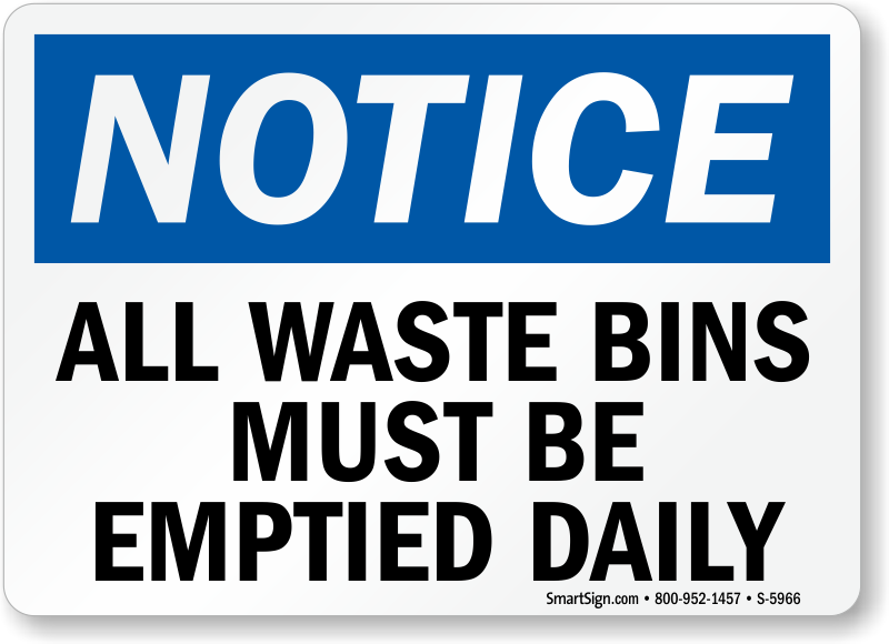 Place this All Waste Bins Must Be Emptied Daily OSHA Notice Sign to get the dumpster cleaned daily.