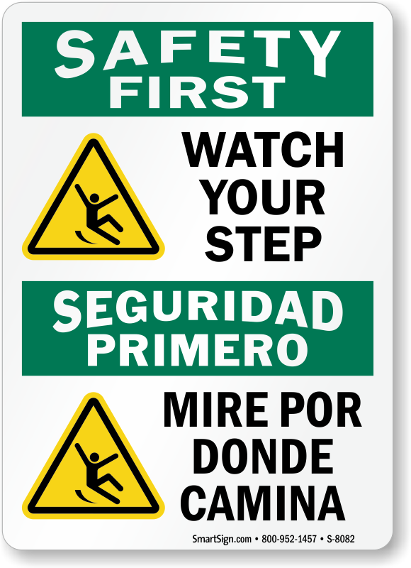 Prevent a slip accident due to haste and negligence towards safety at workplace. This Bilingual Safety First Sign is impactful.