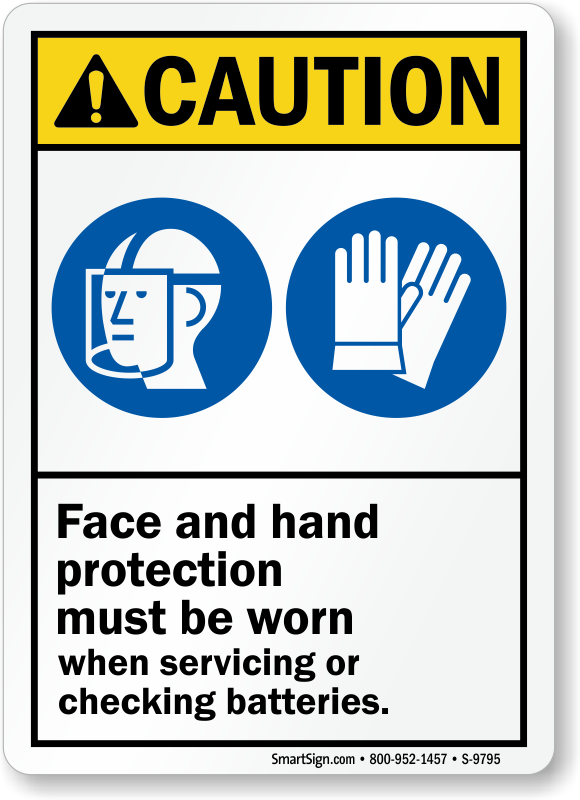 Prevent dangerous situations. Use a 'Face and Hand Protection Must Be Worn When Servicing or Checking Batteries' sign and ensure workers' safety.