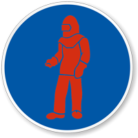 Warn firefighting personnel of highly toxic chemical agents in the storage facility. The vivid icon in red notifies firefighters that they must wear a service-certified gas mask, impermeable suit, hood, and boots.